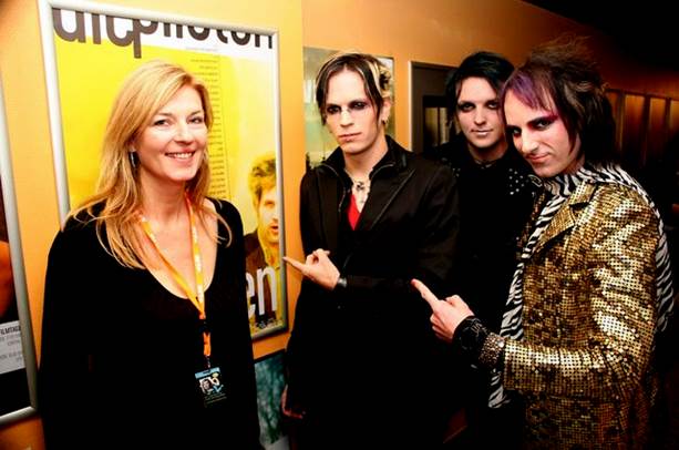 Cordula Kablitz-Post mit drei Protagonisten ihres Films: Den Glamrockern von "The Pleasures".